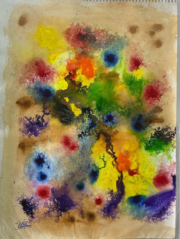 لوحة أصلية من عمل عثمان الخزيم - رسام سعودي من الرواد - أكريليك وأحبار ملونة على ورق.