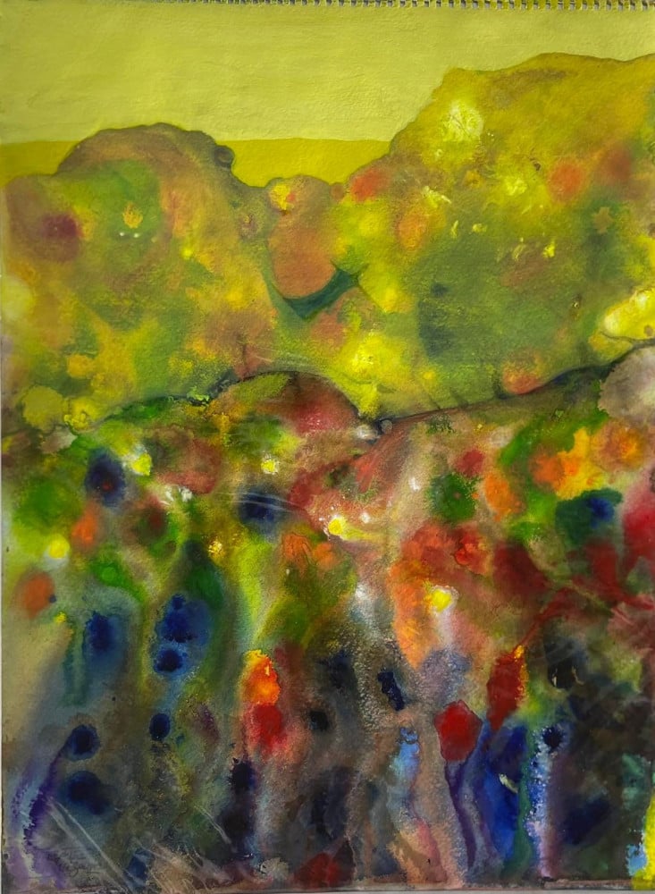 لوحة أصلية من عمل عثمان الخزيم - رسام سعودي من الرواد - أكريليك وأحبار ملونة على ورق.